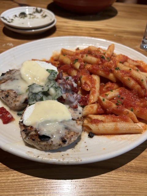 Dinner: Chicken Bryan (grilled chicken with goat cheese, sun dried tomatoes, and a lemon sauce) at Carrabba’s with a side of pasta and meatballs as an app to start