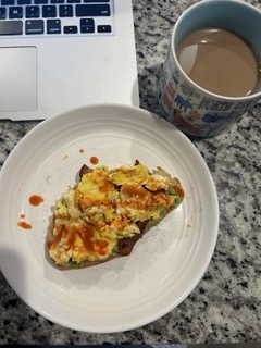 Breakfast: collagen coffee and breakfast burrito (egg, spinach, turkey bacon, salsa, avocado, hot sauce)